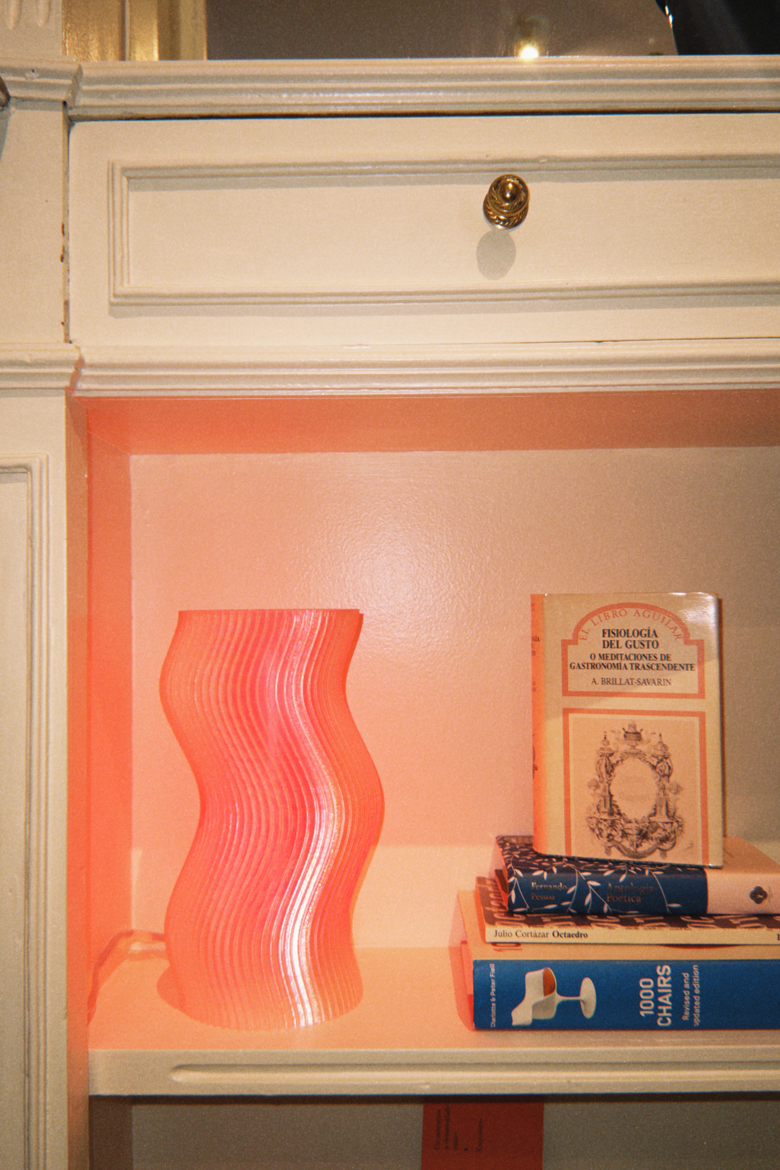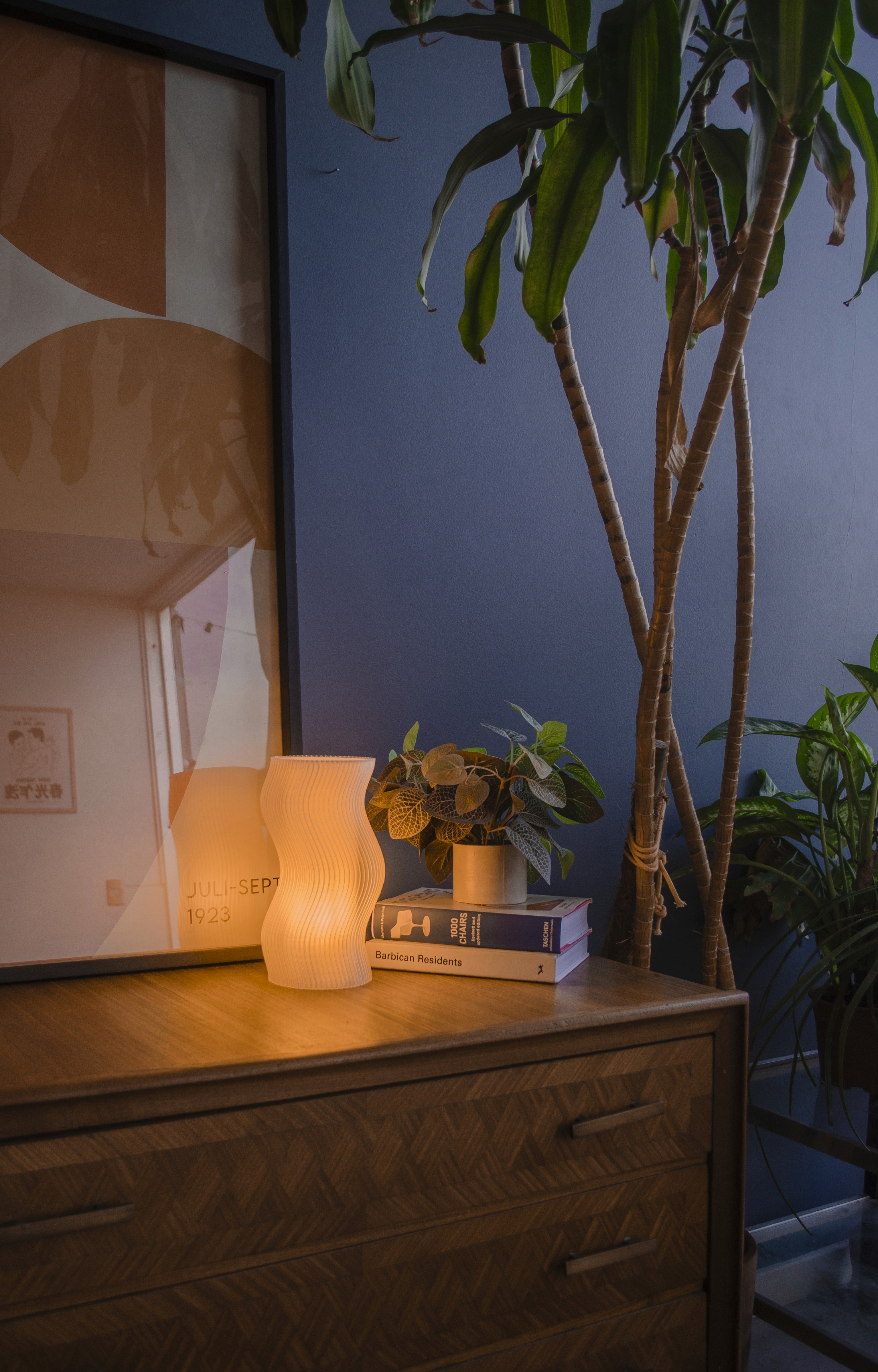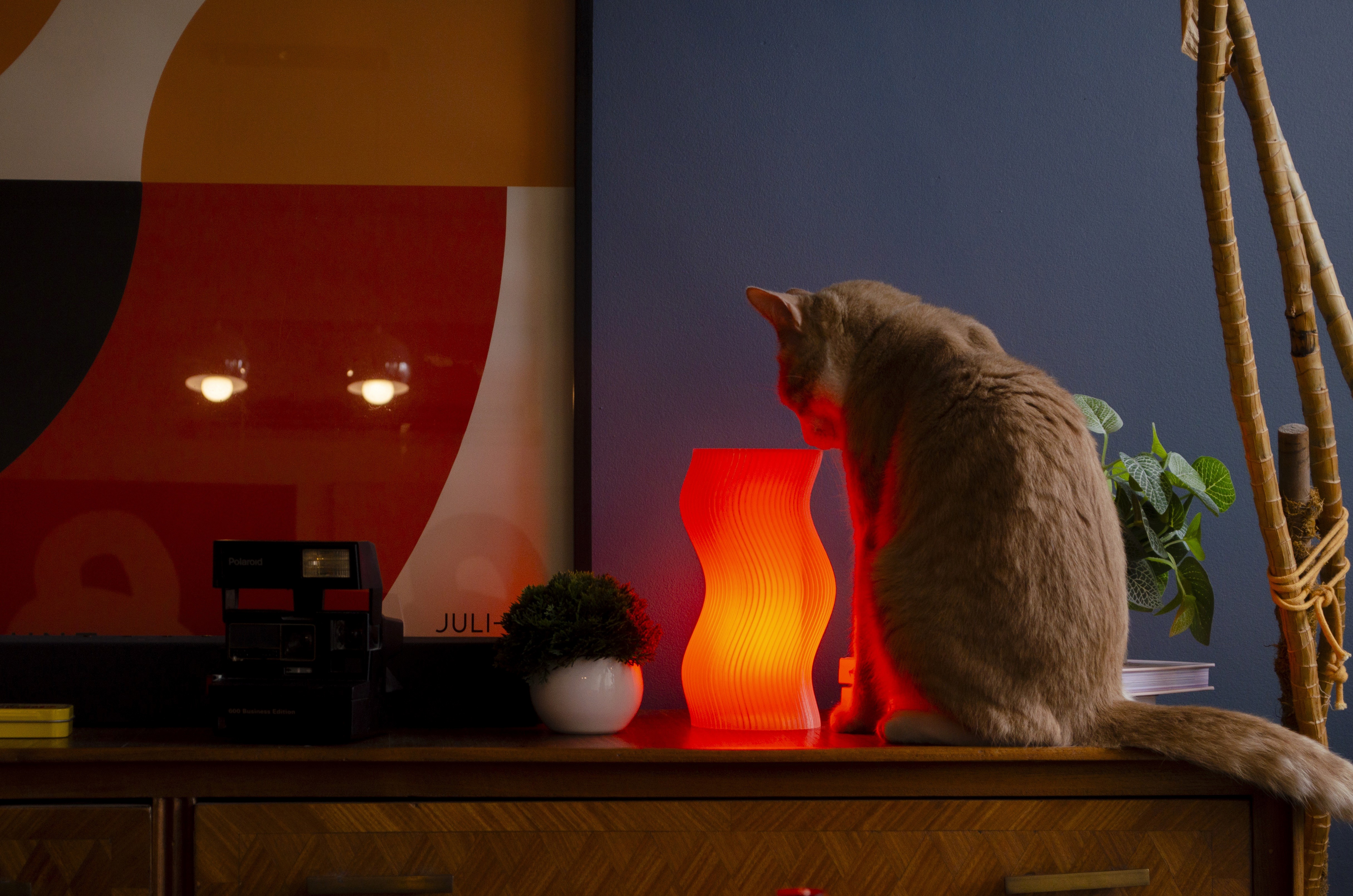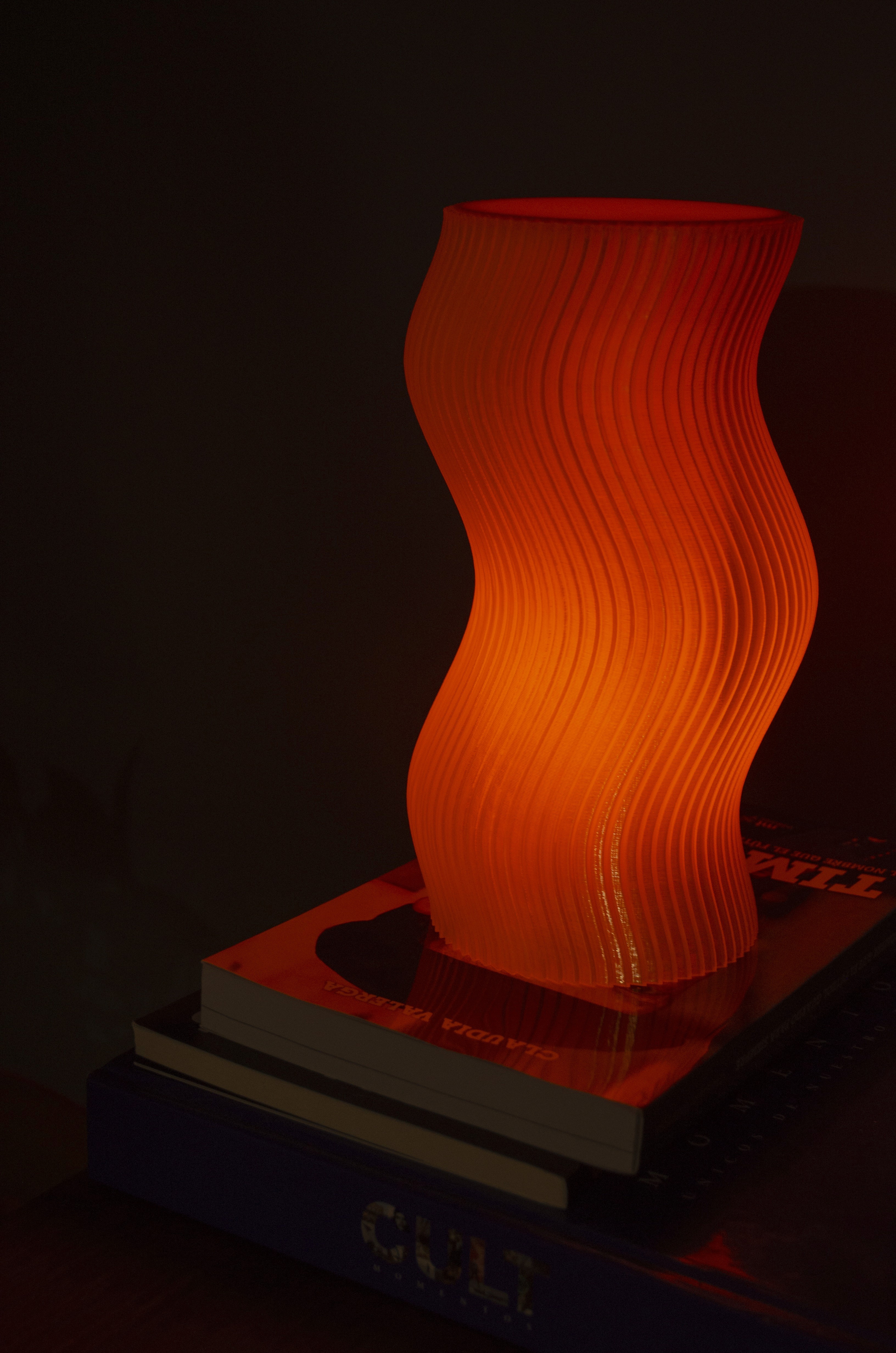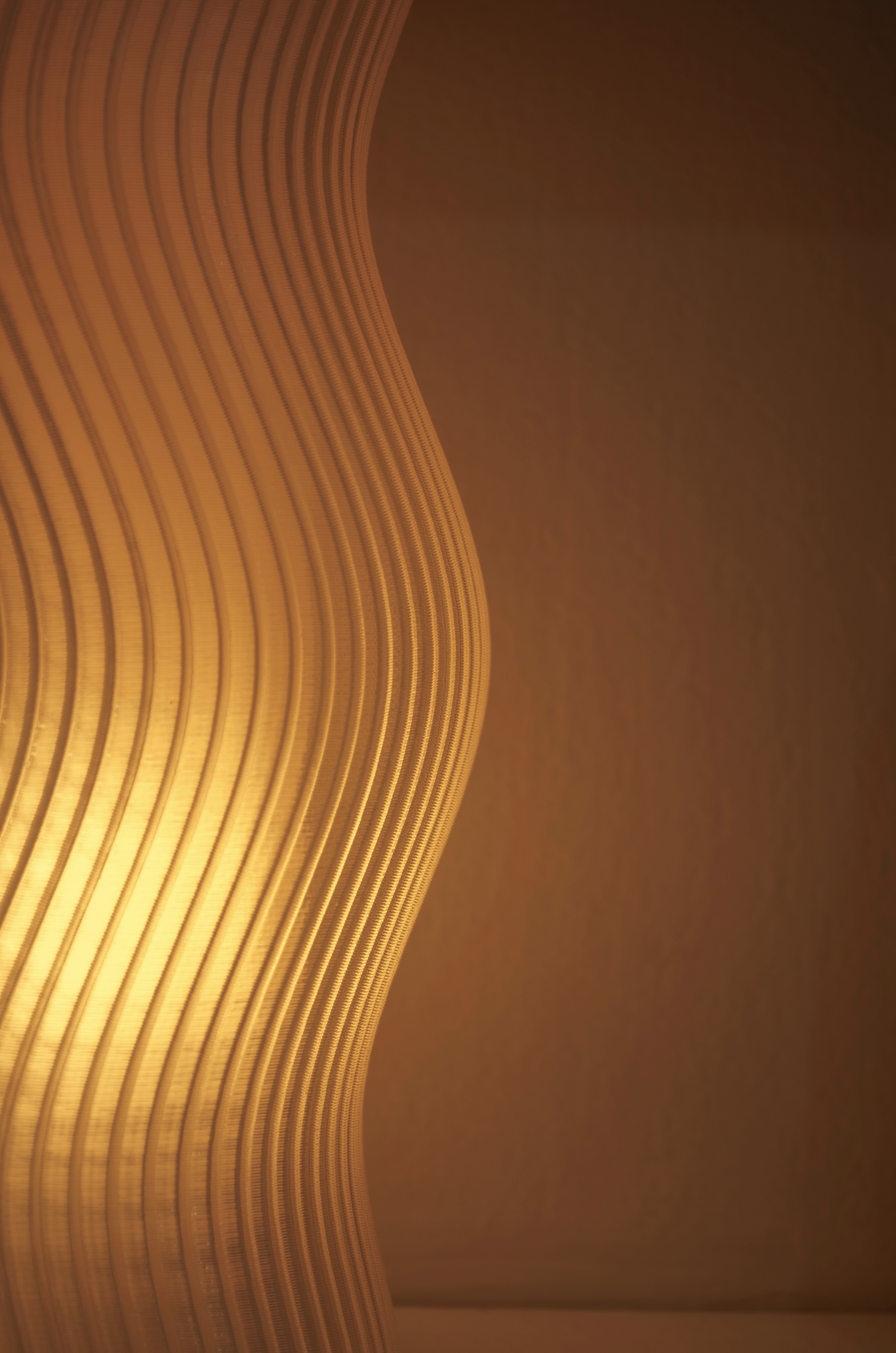 El nombre proviene de la letra griega *λ* (*lambda*), símbolo que en física representa la **longitud de onda**: la distancia entre dos crestas consecutivas de una oscilación. En el lenguaje de la luz, *lambda* define su identidad —cada color, cada frecuencia, cada vibración—. Es una medida y, al mismo tiempo, una firma: la huella visible del movimiento. El modelo **Lambda** se inspira en esa naturaleza ondulatoria. Su geometría se construye a partir de un ritmo continuo de curvas que ascienden y descienden como una señal detenida en el aire. La luz recorre su superficie siguiendo ese mismo pulso, revelando crestas y valles. En **Lambda**, forma y energía son una sola cosa. La materia vibra, la luz la acompaña, y en ese diálogo se define el espacio.